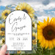 These are elegant, minimalist wedding invitations. The clear acrylic card features sunflowers in yellow and brown earth tones; emphasizing brown green and yellow tones. They also include a sophisticated stylish black text combined with a "Vintage Modern Boho Bohemian Wedding Theme", written in a lovely, whimsical cursive font. The black font was used for the bride's and groom's name on the invitation.