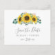 This rustic sunflower horizontal save the date postcard is perfect for a country wedding. The bohemian floral design features yellow sunflowers, blush pink flowers and hunter green eucalyptus greenery in watercolor with an elegant modern boho feel.