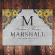 Rustic white wood with sunflowers and black lace cutting board with the couples first names, last name monogram, full last name, and wedding date available in customizable templates. A cute country barbecue themed gift to help celebrate a summer wedding cookout.
