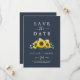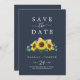 This rustic sunflower navy save the date announcement card is perfect for a country wedding. The bohemian floral design features yellow sunflowers, blush pink flowers and hunter green eucalyptus greenery in watercolor with an elegant modern boho feel.