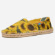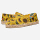 Rustic watercolor style country sunflowers are patterned over these espadrilles made for you by hand in Africa. The sunflower pattern is displayed on an olive background which you may change to another color - the neutral and black canvas look great, in my opinion. You can also change the liner inside the shoes. Variations in the layout of the pattern on the shoes can be expected since they are cut out and made by hand.