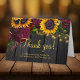 Rustic elegant wedding stylish thank you template card on dark brown barn wood background featuring beautiful sunflower and burgundy roses bouquets. F+++++++++++++++++++ Suitable for elegant summer or autumn fall rustic countryside farmhouse barn garden backyard weddings.