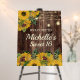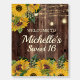 Rustic wood, yellow sunflowers with greenery, and sparkling string lights and lanterns Sweet 16 birthday party foam core easel sign. Contact me for assistance with customization or to request additional matching or coordinating Zazzle products for your party.