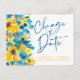 Rustic yellow sunflowers and blue floral bloom bouquet wedding change the date with a hand written style typography.