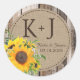 Sunflower bouquet over barn wood planks and linen-look background rustic country monogram wedding label design.
