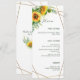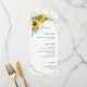 A warm rustic botanical floral wedding menu with bright yellow sunflowers and eucalyptus greenery. Ideal for fall, country, or outdoor weddings. Personalize with your menu items for a cheerful table display.