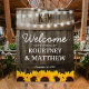 Sunflower vineyard wedding welcome foam board sign featuring a rustic country barn dark oak barrel background, twinkle string lights, golden yellow sunflowers, your initials, and modern wedding welcome template that is easy to personalize.