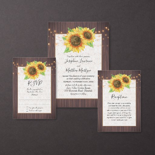 This wedding enclosure card features a watercolor sunflowers design with string lights, lace and wood background. Other matching wedding stationery items are also available. Please visit the collection pages in our store to see the full range.