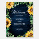 Elegant and modern rustic country wedding welcome sign features bright yellow sunflower blossoms and baby's breath / gypsophila floral frame with leaves on navy blue barn wood background. Please find more matching designs and variations from my "blissweddingpaperie" store. And feel free to contact me for further customization or matching items.