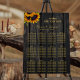 Elegant rustic country wedding seating chart foam board template with 12 predefined gold script tables (120 guests) on a dark brown barn wood background featuring a chic sunflowers bouquet. +++++++++ Personalize it with your details and bride's and groom's names! +++++++++++ If you need help in accommodating to your guests number, please contact me!