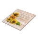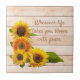 All the tough beauty of sunflowers bunched on a corner of a rustic wooden background. The design contains muted ochres, bright vibrant yellows, pink and green