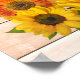 All the tough beauty of sunflowers bunched on a corner of a rustic wooden background. The design contains muted ochres, bright vibrant yellows, pink and green