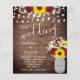 This affordable wedding design features a mason jar vase filled with red roses, sunflowers and baby's breath on a rustic wood background with string lights. Click the customize button for more flexibility in modifying the text. Variations of this design, different paper types, as well as coordinating products are available in our shop, zazzle.com/store/doodlelulu. Contact us if you need this design applied to a specific product to create your own unique matching item! Thank you so much for viewing a DoodleLulu by 2 june bugs design!