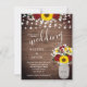 This design features a mason jar vase filled with burgundy / dark red roses, sunflowers and baby's breath on a rustic wood background with string lights. Click the customize button for more flexibility in modifying the text. Variations of this design, different paper types, as well as coordinating products are available in our shop, zazzle.com/store/doodlelulu. Contact us if you need this design applied to a specific product to create your own unique matching item! Thank you so much for viewing a DoodleLulu by 2 june bugs design!
