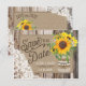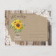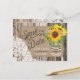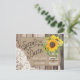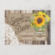 Barn wood and sunflower bouquet in mason jar with burlap and lace tied with twine and white lace over linen-look background rustic country save the date postcard.