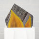 A stylized abstract depiction of a sunflower with bold sweeping lines and striking color contrasts. The sunflower itself rendered in shades of golds, yellows and oranges and is set on a beautiful rustic barnboard background.