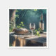 A rustic wooden table set in a serene forest clearing holds a bottle of wine, a glass, and a freshly baked loaf of bread