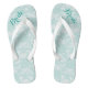 These flip flops feature a background of teal lace and darker teal customizable text at the top toe area that reads: Bride.