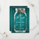 Rustic teal wedding save the date card featuring a mason jar and burlap hearts against a barn wood background adorned with twinkle lights. Easily personalize this romantic rustic teal wedding save the date online. Matching items available to complement this teal wedding save the date card.