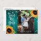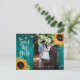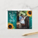Rustic floral wedding save the date photo postcards featuring sunflowers and string lights on a barn wood background. Ideal card design for a teal rustic wedding party inspired by sunflowers. Monogram wedding save the date postcard.