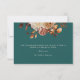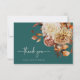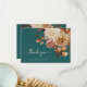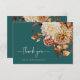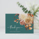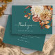 Rustic Teal Thank You Card. Express your thanks with grace and charm using this thank you card featuring elegant script lettering. The rich teal background is adorned with watercolor artwork of fall leaves in burnt orange and terracotta, along with soft beige dahlias and coppery roses, creating a warm and refined finish to your wedding suite. This card pairs heartfelt words with seasonal beauty for a meaningful final touch. Personalize it to make your gratitude even more personal.