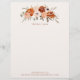This elegant stationery letterhead features a rustic bohemian bouquet of orange, peach, blush, and taupe flowers and neutral botanical leaves on a soft, bush pink background with terracotta colored text.