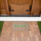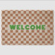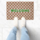 Stylish, trendy, cool, rustic vintage retro style terracotta / rust / burnt orange / brown checkered check checker design pattern, modern green typography font welcome, sleek, low-profile vibe, tough, rugged, durable, naturally weather-resistant, all weather, summer rain spring winter christmas holiday, stain-resistant, with non-slip PVC backing, 100% natural coconut coir fiber mat. Makes a great custom gift for birthday, fathers day, mothers day, wedding, graduation, christmas, xmas, holidays, new years, housewarming, and more, for your loved ones, mom, dad, grandpa, grandma, new homeowners, pet owners, families, couple, garden enthusiasts, RV owners, friends and family.