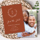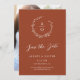 This elegant wedding save the date features a beautiful terracotta color background, hand-drawn wildflower wreath, your initials, and elegant typography. On the back is your photo in vertical format. The photo on the back is removable if needed. It's a perfect design for a rustic yet elegant wedding! See the collection for more items!