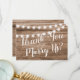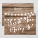 Thank you wedding officiant card featuring a rustic wood background, string lights, and a personalized template.