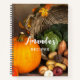 A personalized spiral notebook with a photograph of a thanksgiving harvest, set on a rustic wooden table. Pumpkin, potatoes, squash etc... make up this bountiful collection of food. Colorful autumn leaves surround the cornucopia basket.