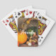 Playing cards with a photograph of a thanksgiving harvest, set on a rustic wooden table. Pumpkin, potatoes, squash etc... make up this bountiful collection of food. Colorful autumn leaves surround the cornucopia basket.