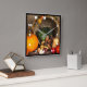 A clock with a photograph of a thanksgiving harvest, set on a rustic wooden table. Pumpkin, potatoes, squash etc... make up this bountiful collection of food. Colorful autumn leaves surround the cornucopia basket.