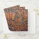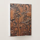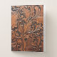 Rustic brown pocket folder on a tooled faux leather background.