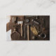 This business card features a photograph of rustic tools on a wooden surface.