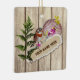 A rustic design with a wood background, torn paper, a bird on a branch, a sea shell, and a fern leaf collage. It's oil painted. You can personalize it with your own name. Just click personalize. Delete " your name here." And type in your name. If you wish to change the size of the fonts, color, or font type, click edit design. You will see all the options on the right side of the page. In this area, you can double-click the text image in order to change the text here as well. Then just click done.