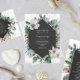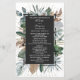 Palm leaves and other botanical designs around dark gray rectangle with white text.