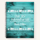 Personalized camper RV journal notebook- Cute rustic teal wood RV camping gift for RV retired couples, and rv campers. Reads 'Our RV Adventures' in handwritten look, white letters. Underneath is personalized names of couple or family. With a cute, white border at the top and bottom of rows of vintage motorhome camper RVs and pine trees. Against a turquoise teal background of rustic, distressed wood boards with knotholes. Fun retirement gift for mom and dad that like to take road trips. Note: All images are printed. Not actual wood. Will appeal to many different tastes and styles. Visit our online Zazzle.com/angela65 shop for matching RV theme decor and more office gifts and unique notebooks.