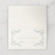 Elegant rustic ornamental floral line art wedding place card with a dusty blue colored vintage botanical frame design.