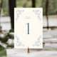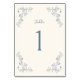 Elegant rustic floral line art wedding table number with a dusty blue colored vintage botanical frame design.