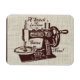 Vintage tinted hand crank sewing machine illustration with "A stitch in time saves nine" text on light burlap
