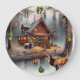 Mountain scene watercolor with deer, fox and a bear outside a rustic log cabin. Large trees, misty forest landscape. Cabin has warm colors and a small lake out front. This would look great in a cabin, or boys room.