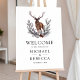 Amaze your guests with this elegant wedding welcome sign featuring a beautiful deer and rustic leaves with modern typography.