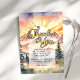 Boho and rustic gender-neutral first birthday design "First trip around the sun" with a watercolor style landscape with mountains, fir trees, and a rising sun.