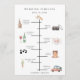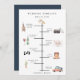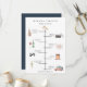 Rustic colorful watercolor wedding day elements, timeline program. Card features church, camera, bottle with glass, plate setting, music notes, cake, bouquet, and retro car. Backing color shown in muted navy blue can be customized. Text font style and color can also be customized.