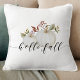 Custom-designed festive pillow featuring "hello fall" modern hand calligraphy with watercolor white pumpkin and foliage design.