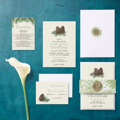 Rustic Pine cone Wedding Invitation rsvp winter wedding labels