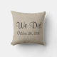 This rustic outdoor pillow has an illustrated linen/burlap background, and says "We Did" and the wedding date of the newly married couple on the front, and "Mr and Mrs" with their new last name on the back, making it the perfect accent pillow for an outdoor wedding sweetheart table, and the newlyweds patio, deck or front porch after the wedding.