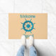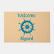 Doormat Welcome Door Mat with customizable text typography template Welcome Aboard and printed with Rustic Weathered Boat Steering Wheel Photo Image with a summer tan sand background color is part of our always expanding original photography collections by TheFabricSeal print on demand shop at Zazzle.com #ZazzleMade ©️Original. https://www.zazzle.com/store/thefabricseal