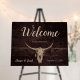 Rustic bull cow skull western country cowboy design. Welcome your guests with this wonderful foam core wedding sign. Brown texture farmhouse style. Old wild west vintage antique inspired. Cool, trendy, modern farm animal reception decor. Personalized script. Image copyright Marg Seregelyi Photography.