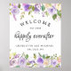 Beautiful wedding welcome sign begins with purple and cream roses tucked into greenery. Happily Everafter is written in a modern flowing scrpt. Personalized with the wedding couples names and wedding date. All of the text can be edited. You can also change the text font, color and size.